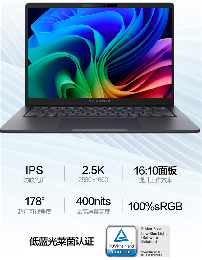 华硕破晓6S 幻金版机配备一块14英寸2.5K IPS高刷护眼屏,拥有144Hz刷新率、100% sRGB高色域与400nits峰值亮度,画面流畅细腻,色彩真实饱满,即便在强光环境下也能清晰显示内容。84%屏占比带来更沉浸的视觉体验,而硬件级低蓝光技术则能从源头减少有害蓝光,有效缓解长时间使用带来的视觉疲劳,兼顾工作效率与眼部健康。