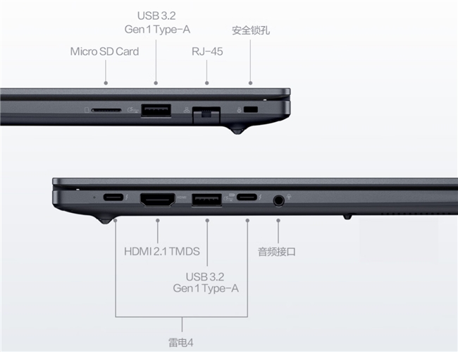 接口方面华硕破晓6S 幻金版可谓“一步到位”,机身两侧集成2个USB 3.2 Type-A、2个雷电4、1个HDMI 2.1、1个Micro SD卡槽、1个RJ45网口以及1个音频接口。无需携带繁琐转接器,即可直连显示器、投影仪、移动硬盘、网线等多种设备,轻松实现多屏协作、高速数据传输与有线网络连接,在不同办公场景中快速组建个人高效工作站。