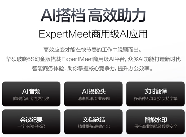 在混合办公常态化的今天,华硕破晓6S 幻金版内置的ExpertMeet AI会议助手成为一大亮点。支持AI降噪拾音、智能视讯优化、实时翻译、会议纪要自动生成等功能,无论是在嘈杂的机场休息室、咖啡厅,还是光线不足的酒店房间,都能确保语音清晰、画面稳定、沟通无障碍,显著提升远程协作效率。