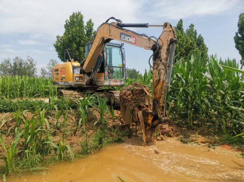 (山东菏泽中支用挖掘机进深挖应急排水渠)