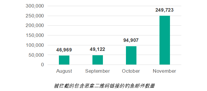 卡巴斯基专家发现,包含恶意二维码的钓鱼邮件数量激增。检测数据显示,此类攻击的检测量在8月仅为46,969例,到11月已飙升至249,723例——增长超过五倍,这表明网络犯罪分子正越来越多地利用二维码。攻击者在邮件中更频繁地使用二维码,因为它们提供了一种简单且经济高效的方式来隐藏恶意URL,从而逃避了许多防护解决方案的检测。
