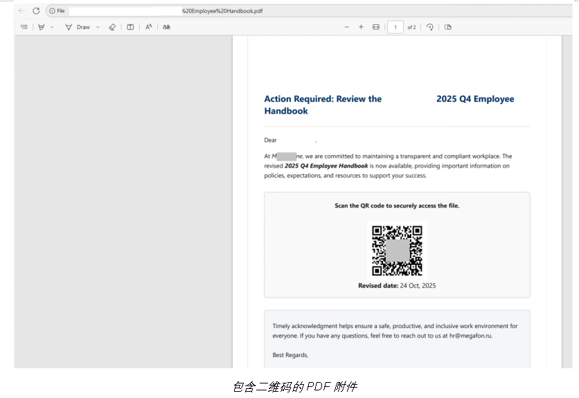 这些二维码通常直接嵌入在邮件正文中,更常见的则是隐藏在PDF附件中——这种手法不仅能隐藏钓鱼链接,还会诱使用户通过手机扫描。相比工作电脑,手机设备的安全防护往往更为薄弱。