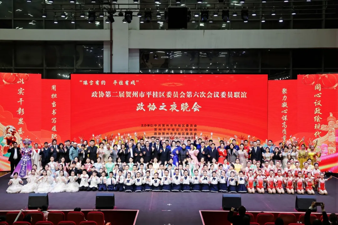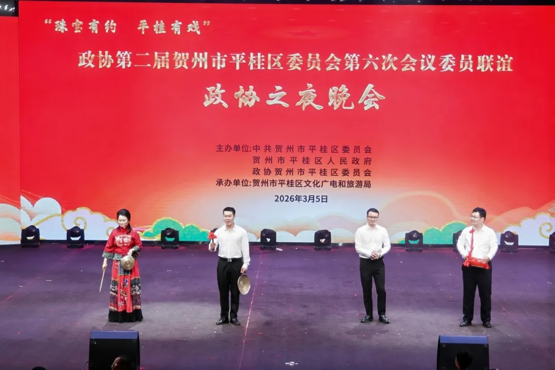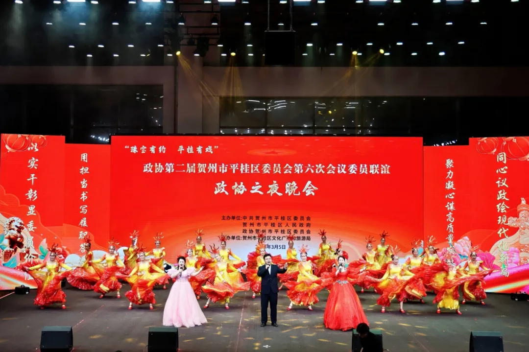 凝心聚智谋发展,文艺联谊话同心。2026年3月5日晚,由中共贺州市平桂区委员会、贺州市平桂区人民政府、政协贺州市平桂区委员会共同主办,贺州市平桂区文化广电和旅游局承办的政协第二届贺州市平桂区委员会第六次会议委员联谊政协之夜晚会在广西东融石材碳酸钙交易中心精彩上演。全体政协委员与群众欢聚一堂,以文艺为媒凝聚发展共识,彰显政协人“围绕中心、服务大局”的使命担当,现场处处洋溢着团结奋进、喜庆祥和的浓厚氛围。