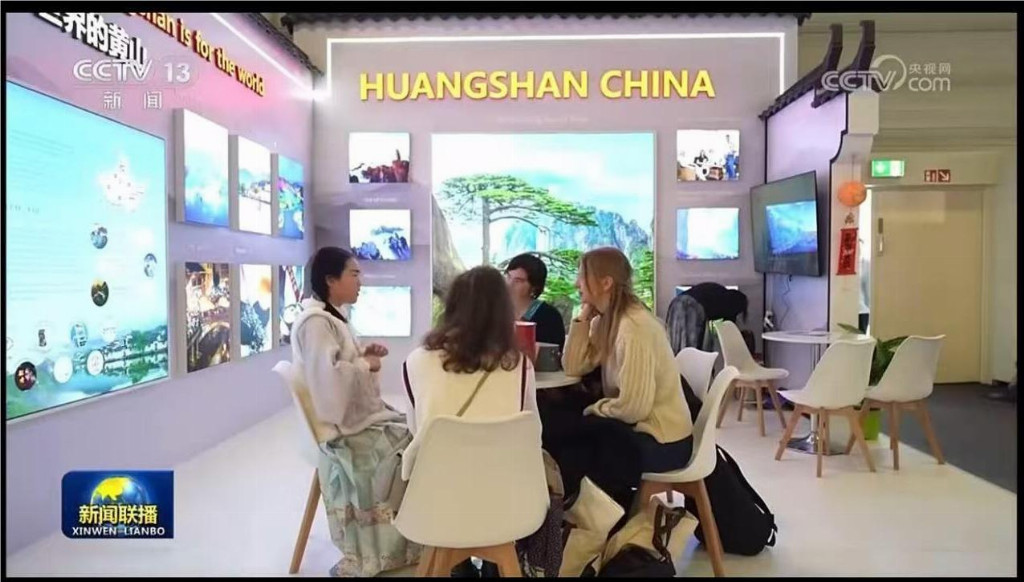 除了活态的非遗展示,黄山绝美的自然风光与焕新的旅游业态也成为展台焦点。通过巨幅背景图片,一幅兼具东方美学与现代质感的山居生活图景徐徐展开:从黄山奇绝的松石云海,到隐匿山巅的高端美宿“雲亼·狮林崖舍”——这座融合了徽州人文意蕴与当代设计美学的山居,正吸引着越来越多追求深度体验的境外旅行者。