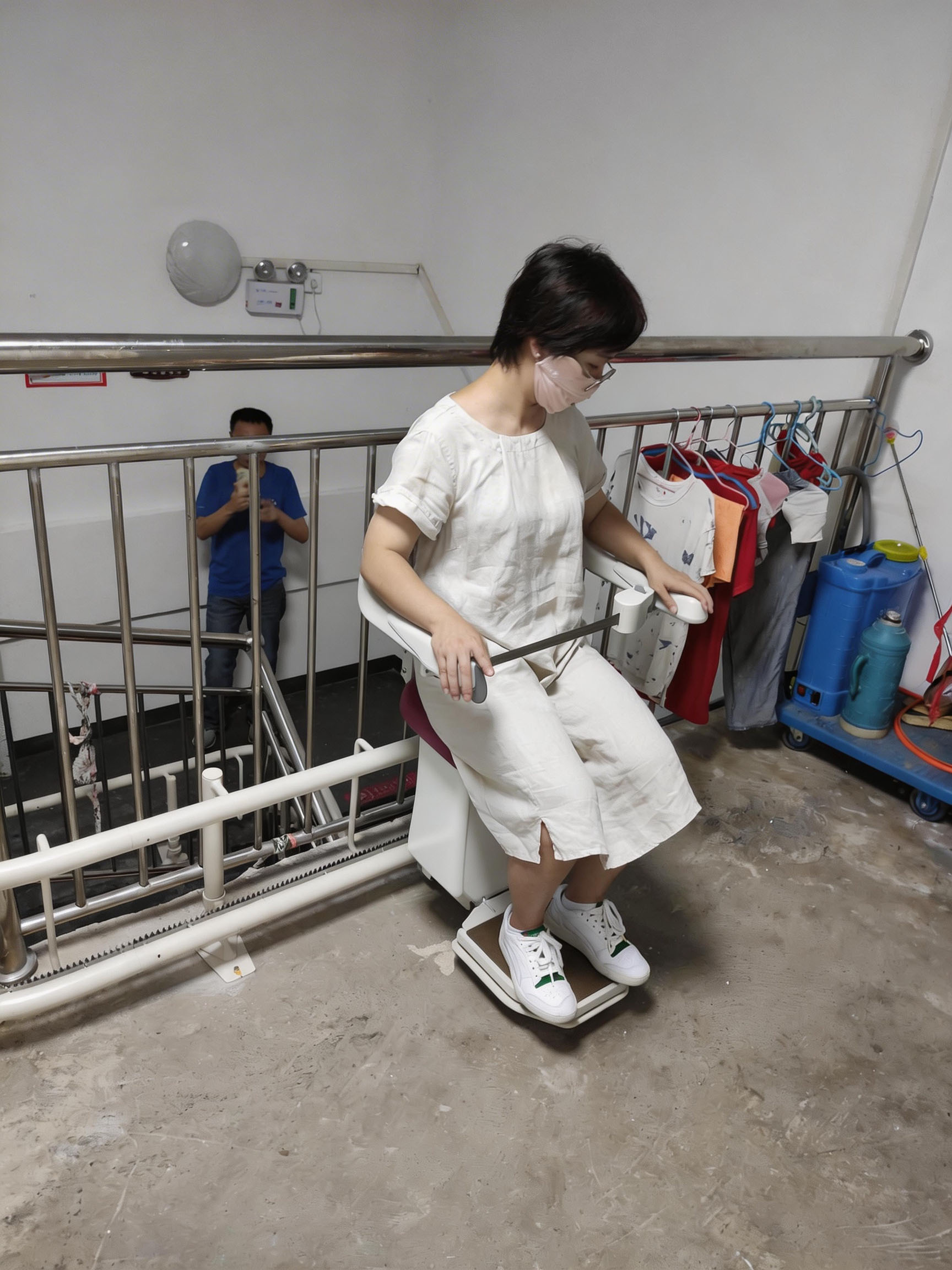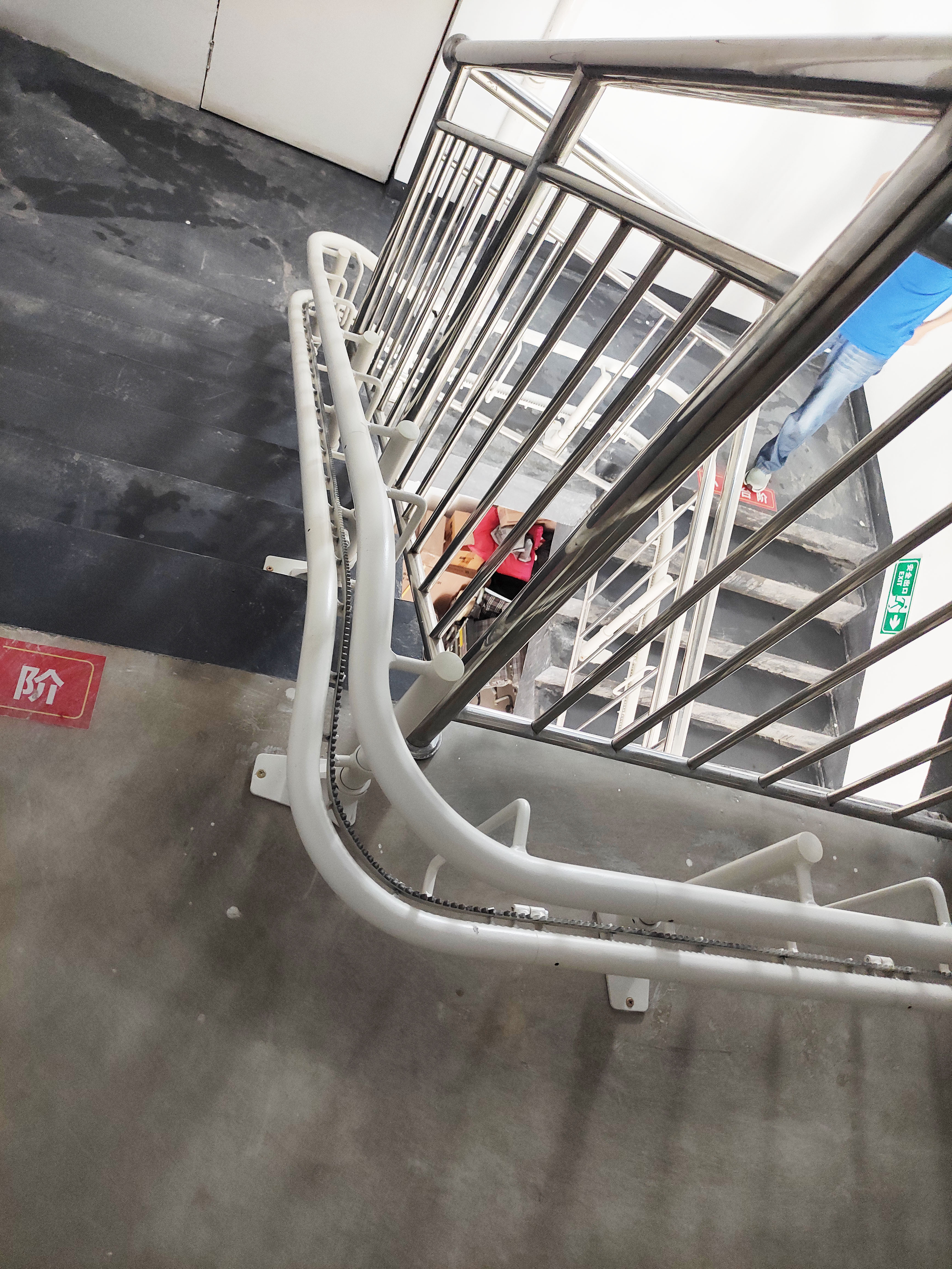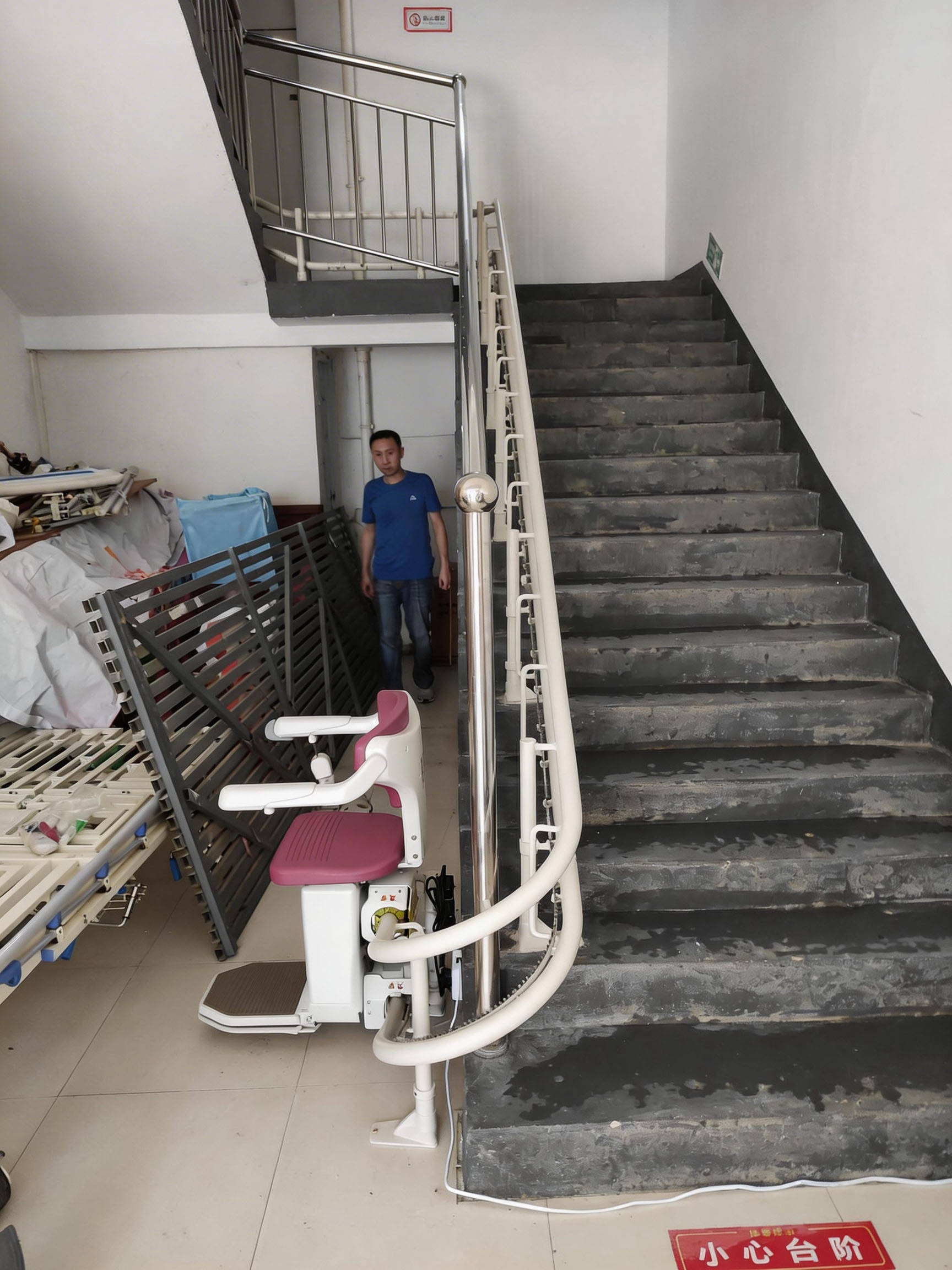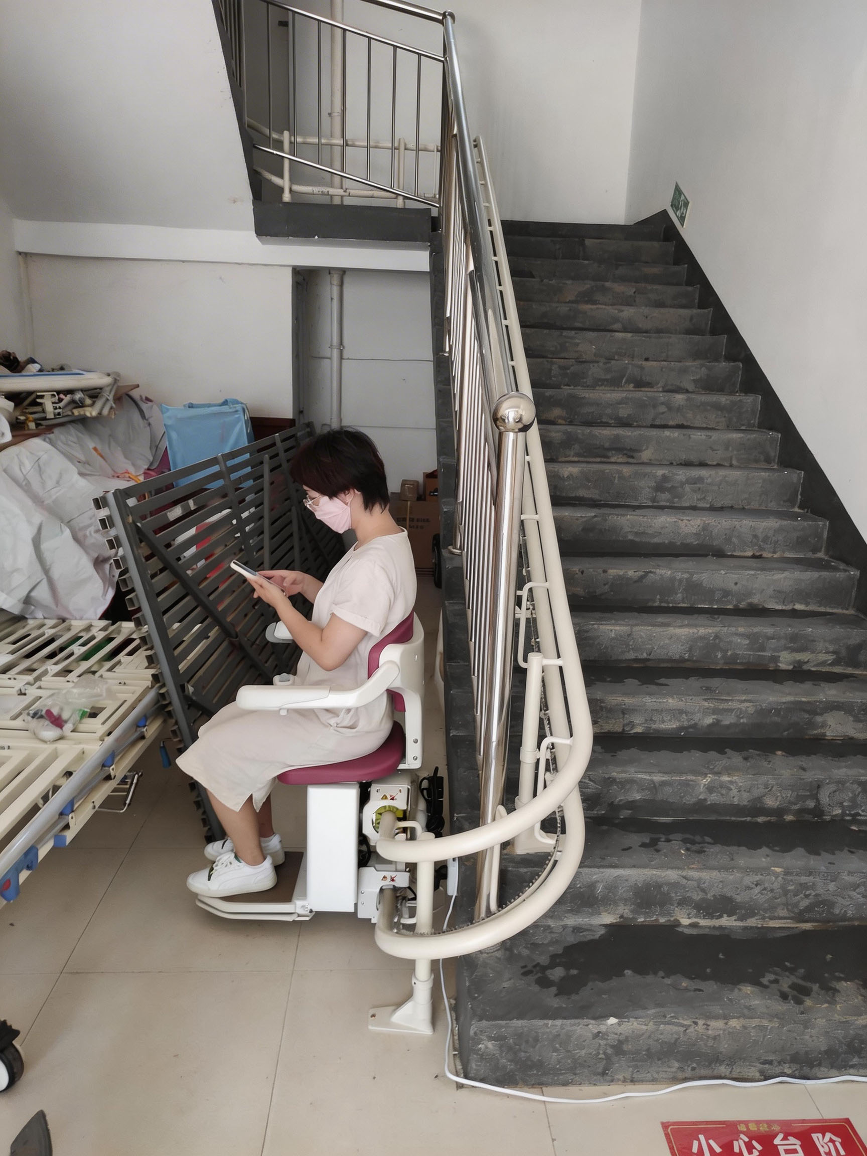 养老院因历史原因无法安装乘客电梯,楼梯为带多处转角的弧形复合结构,传统无障碍改造方案要么无法适配楼梯转角,难以落地;要么安装后占用大量楼道空间,严重影响其他长者与工作人员的日常通行,还可能干扰院内护理、物资转运等工作,难以满足养老院的实际使用需求。