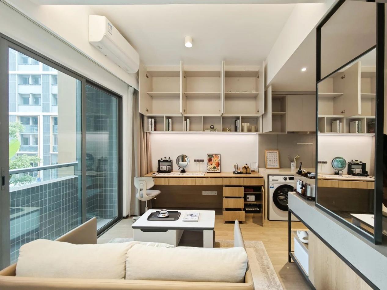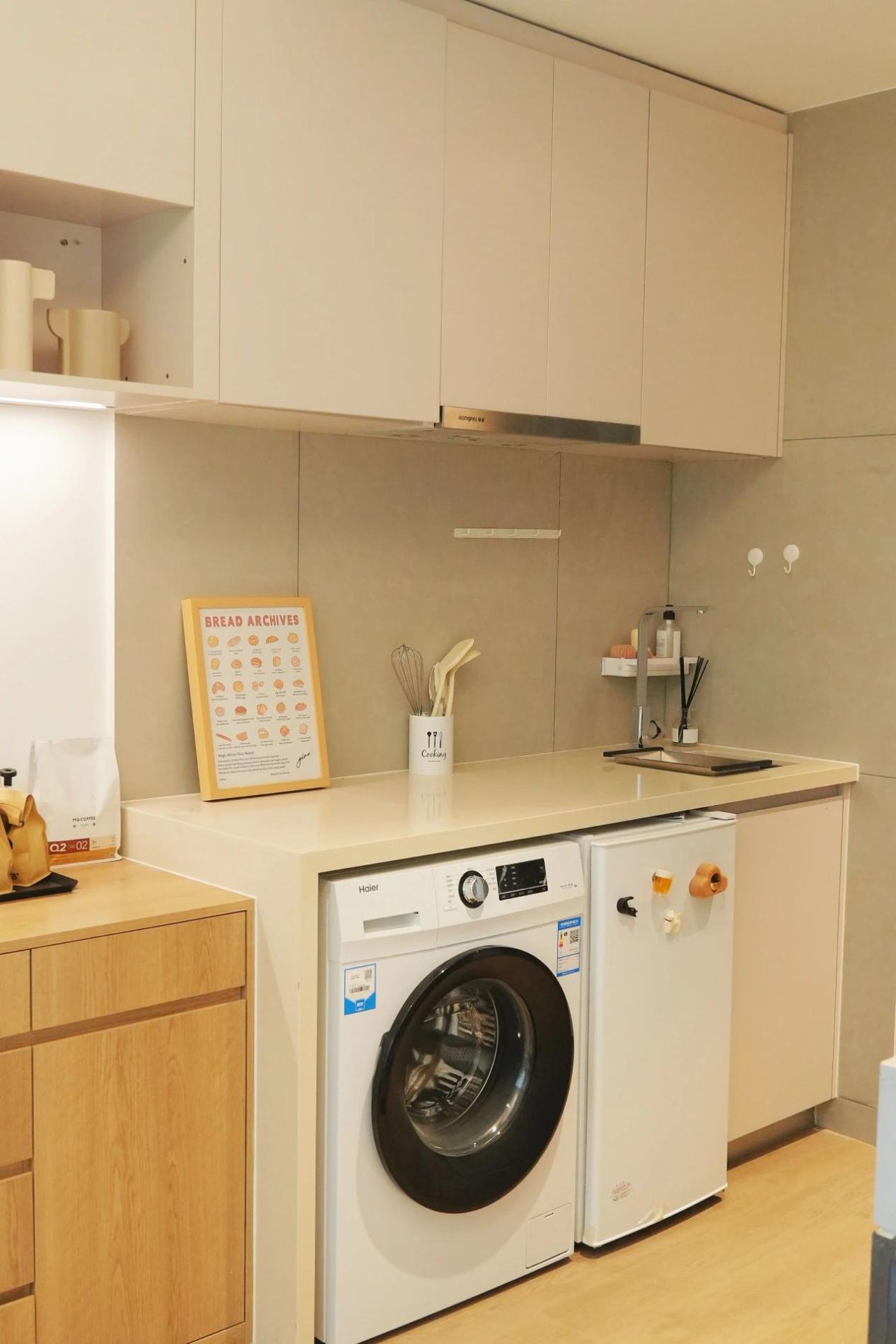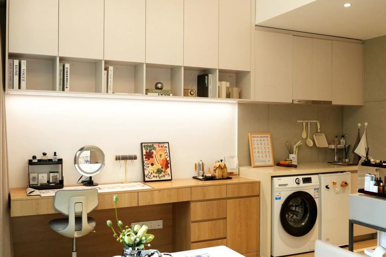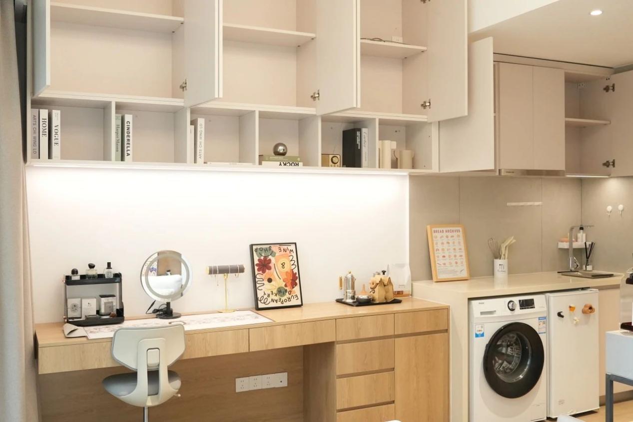 客餐厨卫开放式的格局,我选择了一字型的空间设计,装修出来的效果我觉得挺实用的。书桌、梳妆台、橱柜结合在一起,既满足了日常需求,又节省了空间。橱柜下面还留了空,刚好可以放我的小冰箱和洗衣机,美观又实用!