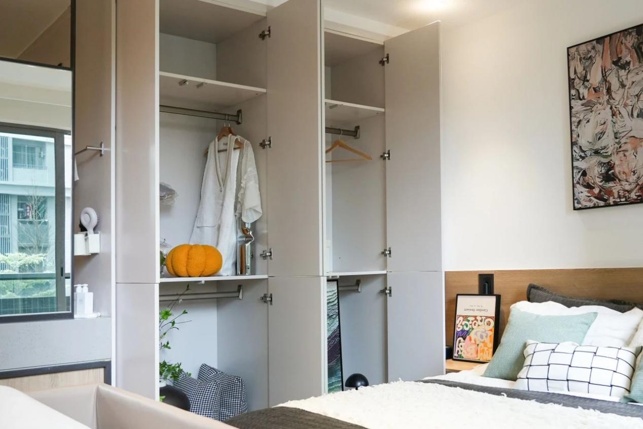 最最重要的衣柜也不能忘!领尚衣柜采用了多挂杆设计,这样子衣服、裙子、长大衣挂起来就不容易起皱。早上上班直接取下来就能穿,不用花时间熨烫,太适合我了!衣柜还是隐形拉手设计的,按压就能开门,既简约又避免了日常走过时磕碰到。