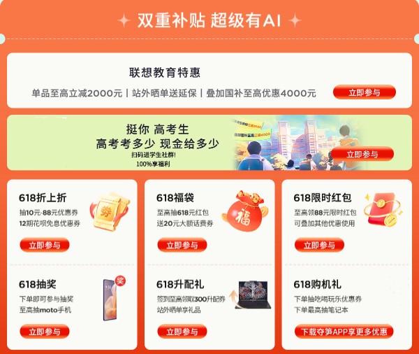 “双重补贴 超级有AI”,联想618再掀年中风暴!今年618,联想携手政府补贴,为广大用户带来福利盛宴。购买PC可享受20%优惠,至高立减2000元,让AI办公与学习高效随行;热门平板同步加码,15%优惠,至高立减500元,优惠触手可及。即刻入手AI装备,创新科技与品质生活从未如此亲近。