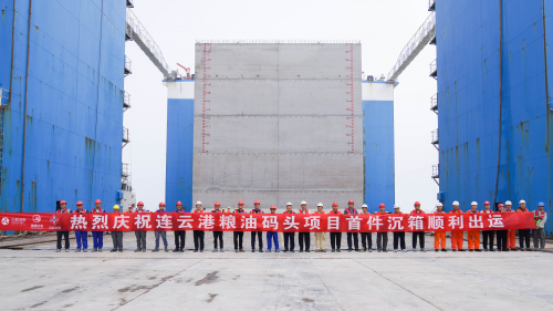 6月11日,连云港港赣榆港区粮油码头项目首件沉箱顺利出运安装。