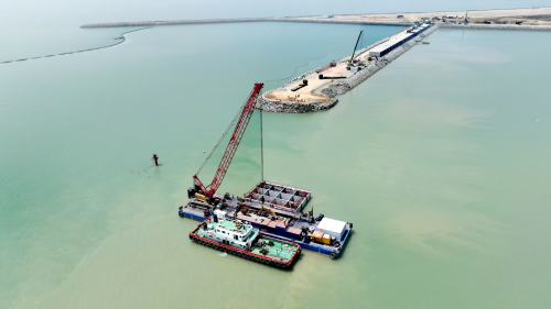 该项目位于江苏省连云港市赣榆区赣榆港区二港池西侧岸线南端,项目拟建一座10万吨级粮油码头,占用规划岸线长度531米,年设计吞吐量500万吨,共计沉箱30件。首件出运沉箱高21米、重2800吨。出运安装中,项目建设团队采用高压气囊顶升移运工艺,利用方驳定位结合精密测量系统,实现毫米级精准安装,为后续码头建设奠定了坚实基础。