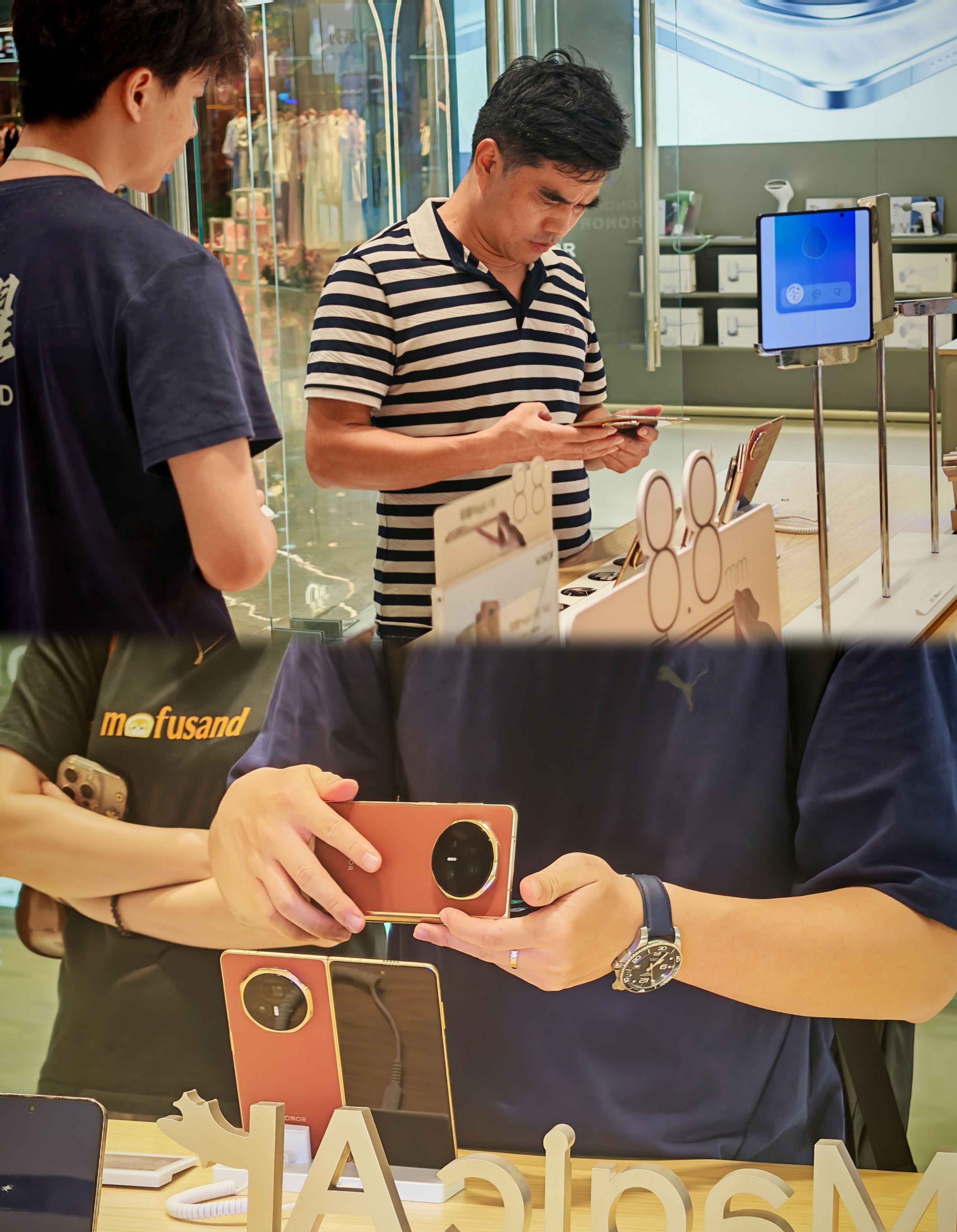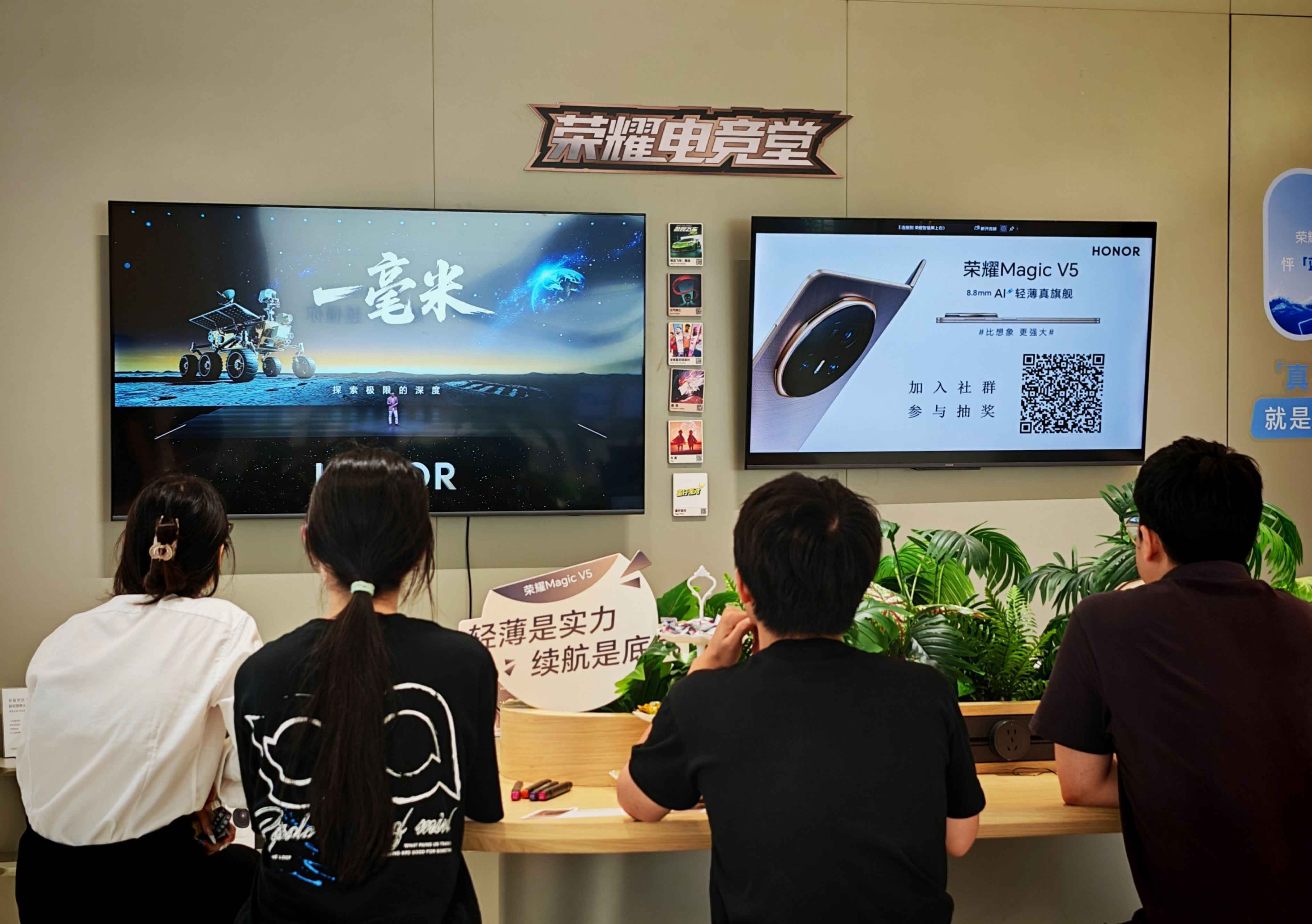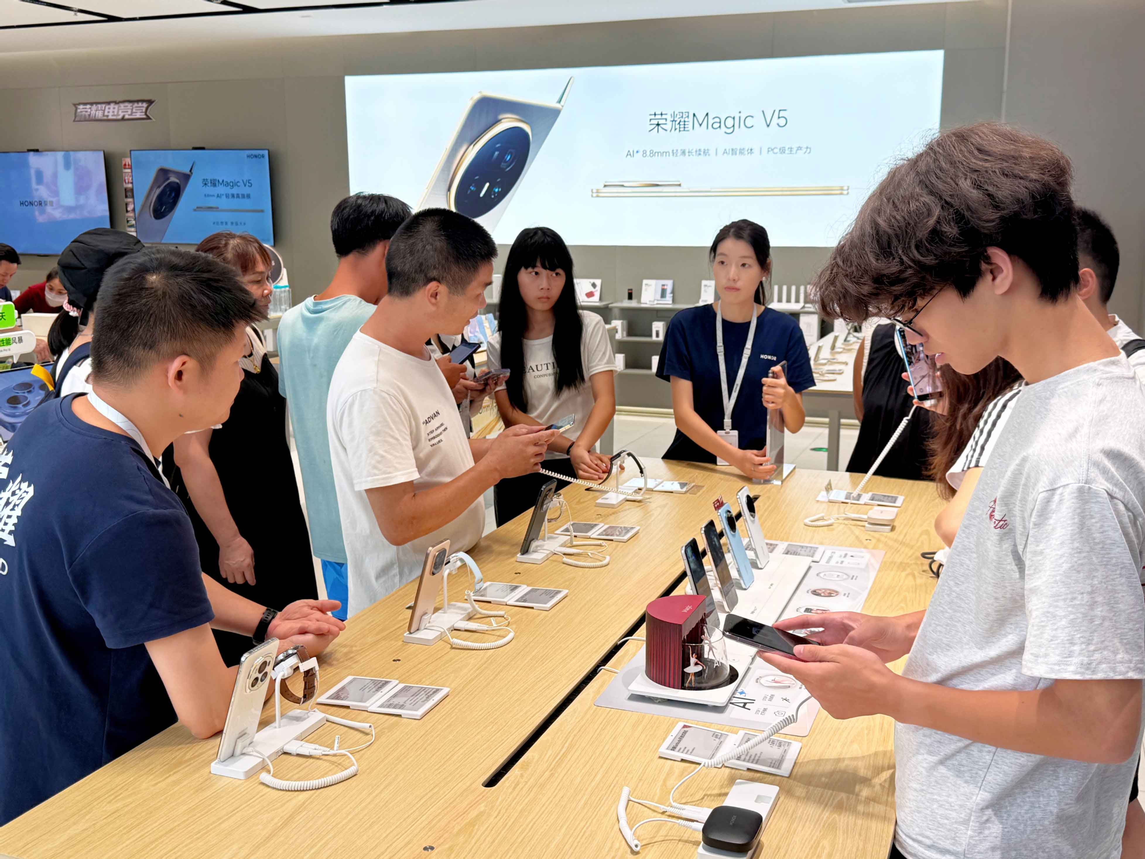 荣耀Magic V5系列7月4日正式开售。在福州、厦门、泉州等地的荣耀线下体验店,记者看到众多消费者蜂拥而至,争相体验荣耀Magic V5带来的折叠体验。