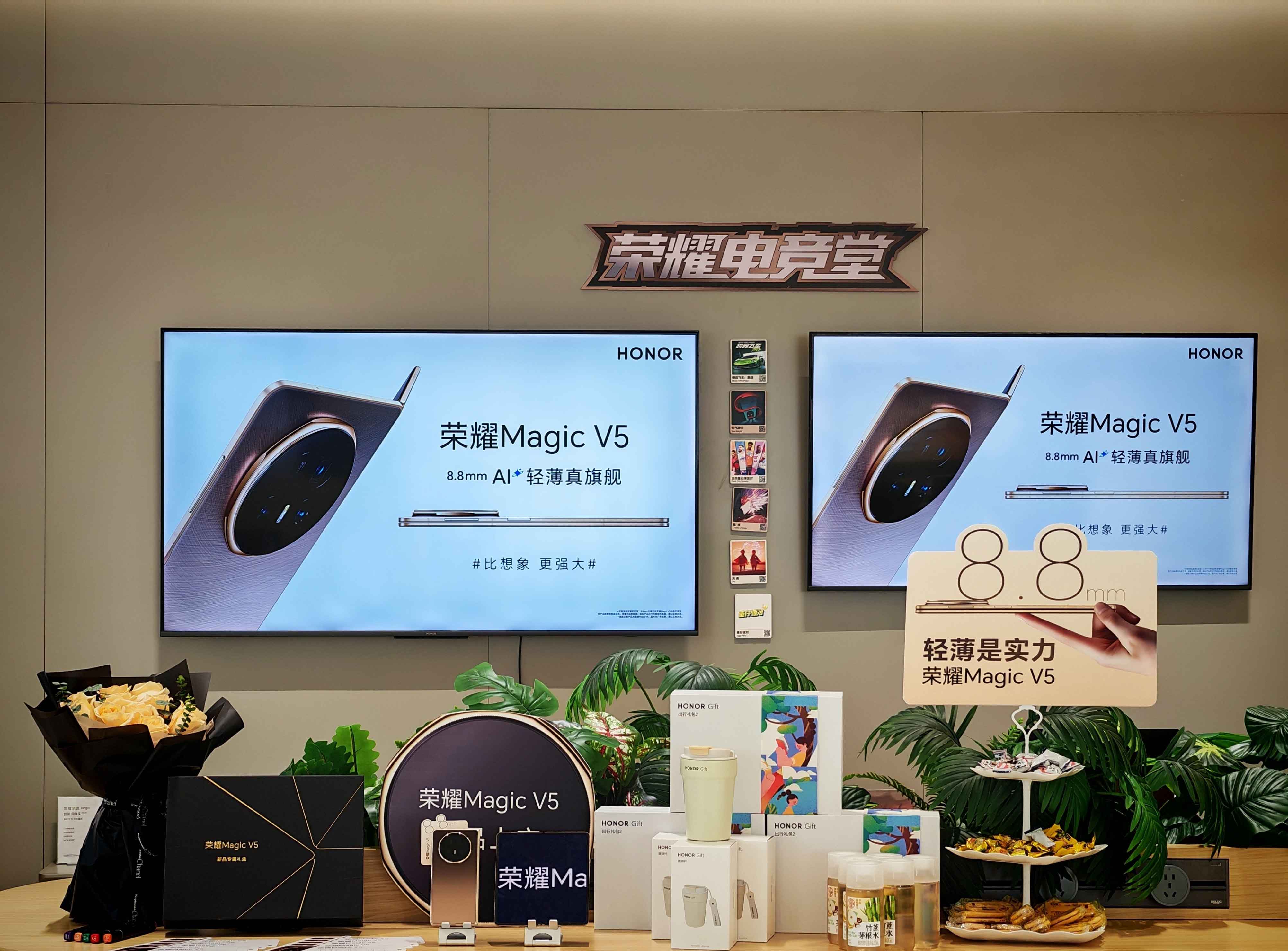 7月2日,荣耀年度折叠旗舰Magic V5正式发布,凭借创纪录的八大“世界纪录”、八大满血体验、八大一语AI应用以及七大AI生态,为用户带来前所未有的“V587”折叠旗舰新体验。该机以8.8mm全球最薄闭合厚度、217g全球最轻(暖白色)的极致轻薄机身,以及突破性的AI智能体、无界全生态互联等创新科技,在福建福州、厦门、泉州等多地荣耀线下体验店引爆体验热潮,吸引大批消费者前往抢先感受。