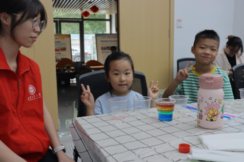 在科学实验工坊,“彩虹杯密度塔”与“气球火箭”实验让孩子们直呼“过瘾”。通过动手操作,他们直观理解了密度分层原理与反冲力知识。团队还为孩子们颁发“创意小达人”“安全小卫士”等趣味奖状,并赠送活动照片与纪念品。一名小朋友兴奋地说:“谢谢哥哥姐姐,我以后想当科学家!”质朴的话语让志愿者倍感温暖。