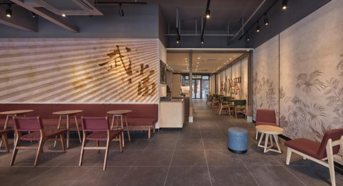 位于武当山景区入口的星巴克十堰大岳武当山金街店,以“第三空间”对话千年古韵,通过匠心设计演绎武当风华。复古门头与半掩卷帘呼应山间亭台古意,苔藓石景点染自然意趣。店门内艺术墙以六把太极扇拼接而成,扇面巧妙融合咖啡图腾、美人鱼与武当文化符号,演绎传统与现代的共生。宣纸晕染墙面将咖啡园景致与山峦云海叠映,旧木构架的山野亭内,咖啡吧台巧妙陈列星巴克与本地文化符号。卡座后折扇墙以咖啡泼墨书写“武当”二字,刚柔笔触定格文化共融。每一处设计细节,皆是对武当山文化底蕴的现代诠释,使”第三空间”成为游客旅行后延伸文化感知的驿站,让游客在咖啡醇香中触摸武当山的活力。
