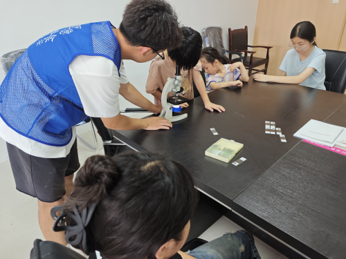 为解决小朋友们对显微技术与生物知识的认知问题,帮助小朋友们掌握显微镜的基础应用逻辑,8月2日,药学与食品工程学院红药先锋志愿服务队于聊城市阳谷县郭屯社区举办以 “显微生灵奇遇,微观世界寻踪” 为主题的社区实践活动。